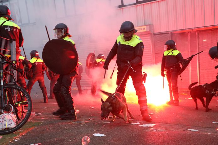 Rond 22.00 uur liep het buiten het stadion uit op rellen tussen fans en de politie. ,,Supporters gebruiken fors geweld in de richting van onze collega'southward", meldde de politie. ,,Wij hebben charges uitgevoerd en politiehonden ingezet. Er zijn inmiddels meerdere aanhoudingen verricht." Om de identiteit van nog niet aangehouden relschoppers te kunnen achterhalen, gaat de politie camerabeelden veiligstellen.
